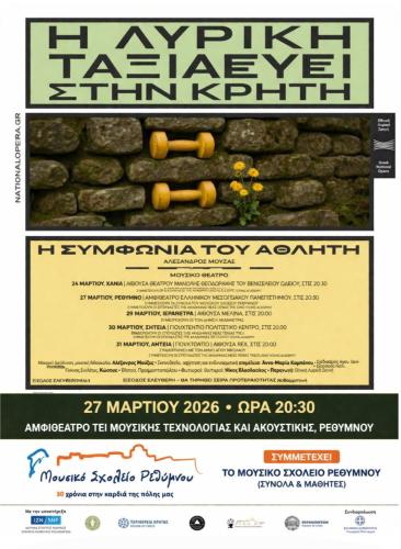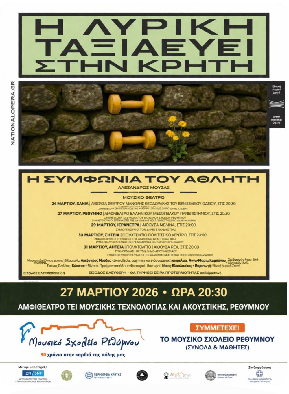 να ζήσετε από κοντά τη «Συμφωνία του Αθλητή», σε συνεργασία με το Μουσικό Σχολείο Ρεθύμνου, μια πρωτοποριακή παράσταση μουσικού θεάτρου του Αλέξανδρου Μούζα, που ταξιδεύει στις πόλεις της Κρήτης από την Εθνική Λυρική Σκηνή.
