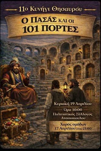 Το 11ο Κυνήγι Θησαυρού Ατσιποπούλου επιστρέφει δυναμικά, προσκαλώντας μικρούς και μεγάλους σε μια συναρπαστική περιπέτεια γεμάτη γρίφους, δοκιμασίες και ανατροπές. Με θέμα «Ο Πασάς και οι 101 Πόρτες», οι συμμετέχοντες θα ταξιδέψουν σε έναν κόσμο μυστηρίου και φαντασίας, αναζητώντας τον κρυμμένο θησαυρό.