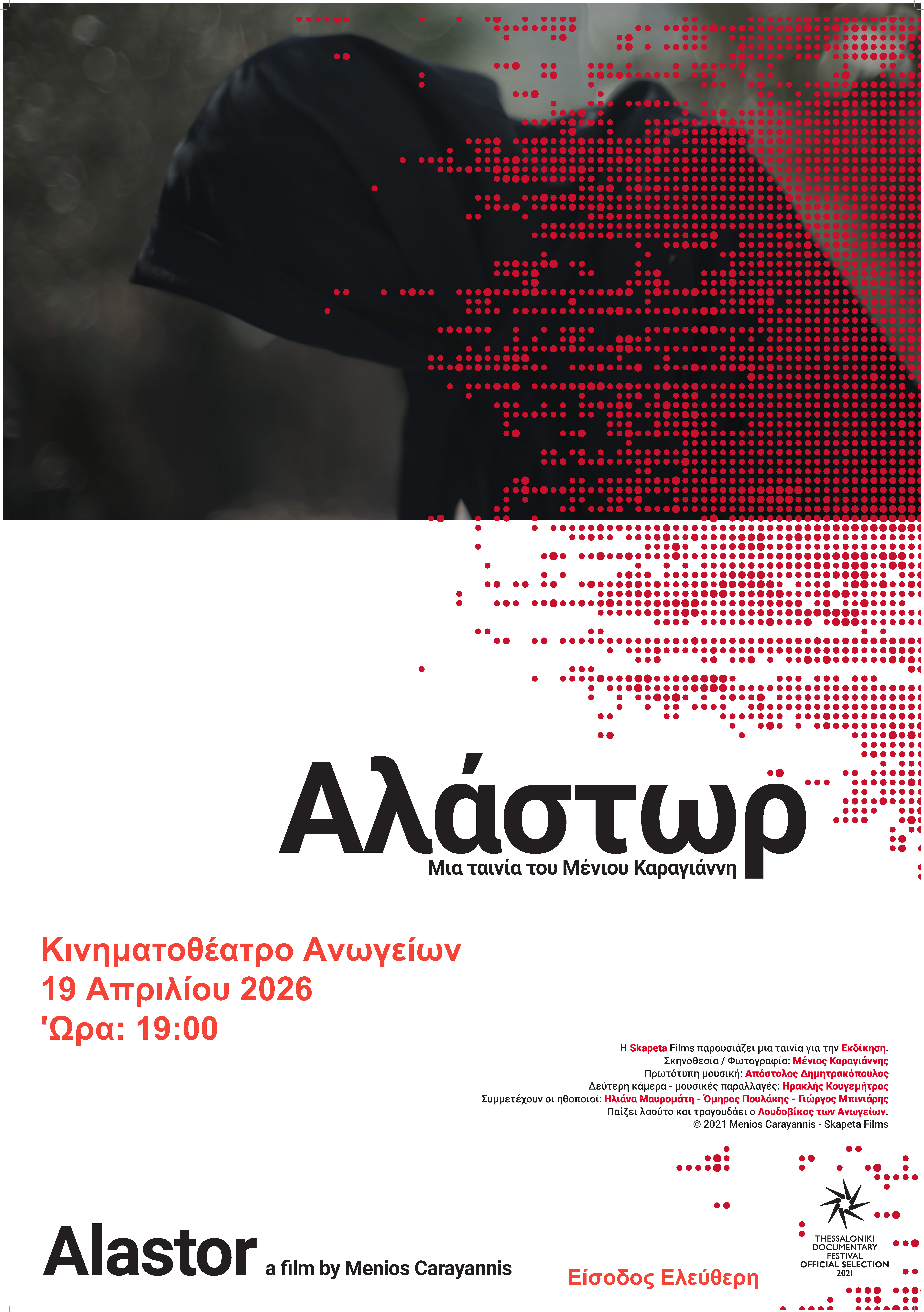 Ο Δήμος Ανωγείων ενημερώνει ότι την Κυριακή 19 Απριλίου 2026 και ώρα 19:00, στο Κινηματοθέατρο Ανωγείων, θα πραγματοποιηθεί η προβολή της ταινίας «Αλάστωρ», σε σκηνοθεσία Μένιου Καραγιάννη.