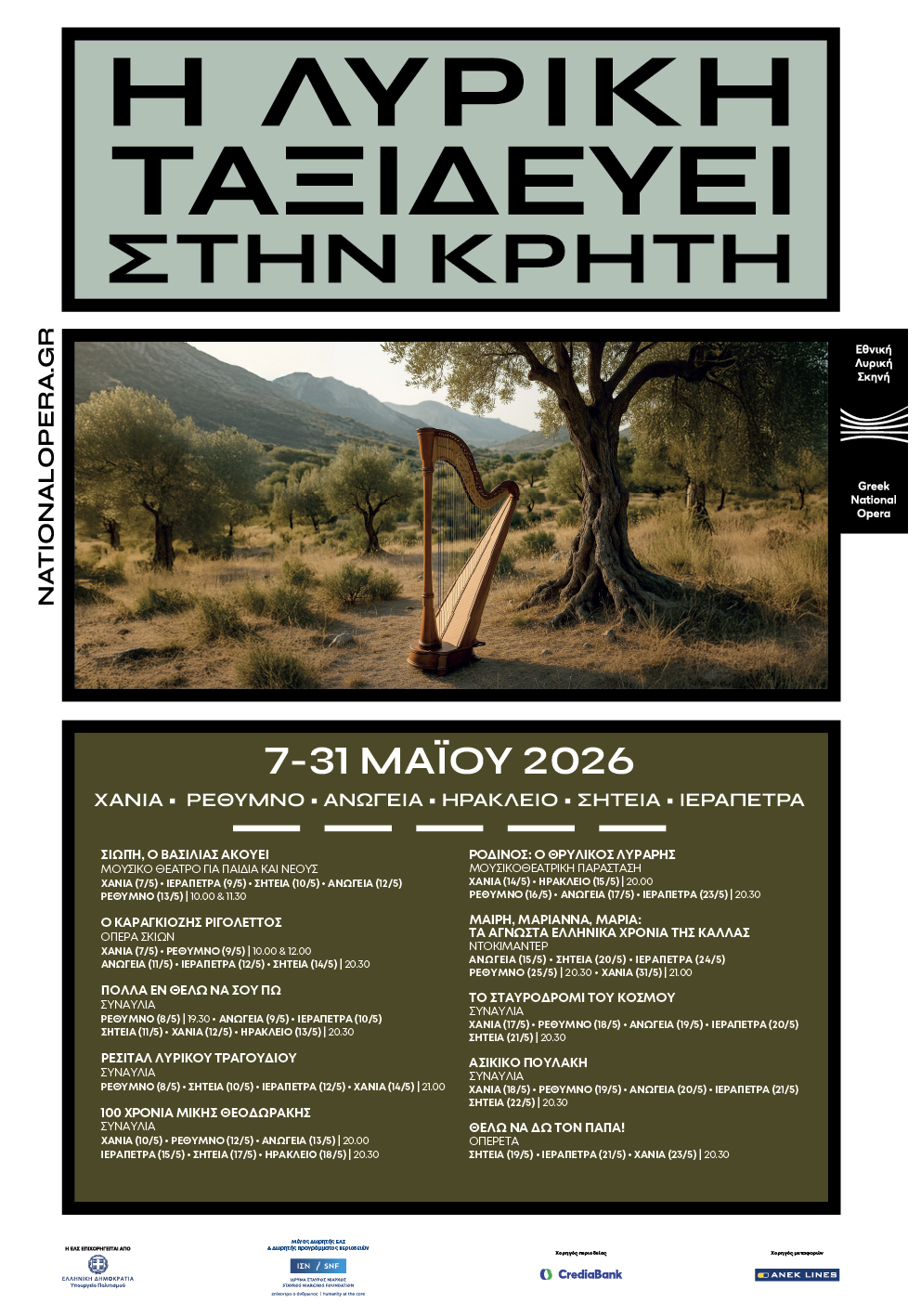 Με μια μεγάλη περιοδεία στην Κρήτη τον Μάιο συνεχίζει η Εθνική Λυρική Σκηνή την καλλιτεχνική εξόρμηση στην ελληνική περιφέρεια. Σε έξι δήμους του νησιού –Χανιά, Ρέθυμνο, Ανώγεια, Ηράκλειο, Σητεία, Ιεράπετρα– η ΕΛΣ θα παρουσιάσει ένα πολυσυλλεκτικό πρόγραμμα εκδηλώσεων που περιλαμβάνει συναυλίες, όπερα σκιών, οπερέτα, μιούζικαλ για παιδιά και νέους, μουσικοθεατρικές παραστάσεις, καθώς και προβολές ντοκιμαντέρ. Από τις 7 έως και τις 31 Μαΐου 2026, θα παρουσιαστούν στην Κρήτη συνολικά 56 παραστάσεις, σε 29 διαφορετικούς χώρους, από θέατρα, εκκλησίες, τζαμιά και ενετικά τείχη μέχρι πλατείες, πάρκα, πεζόδρομους και κινηματογράφους, φέρνοντας τη μουσική και το λυρικό θέατρο πιο κοντά σε κάθε γωνιά του νησιού. Στόχος της νέας μεγάλης περιοδείας, η οποία αποτελεί συνέχεια του εκτεταμένου προγράμματος περιοδειών της ΕΛΣ που ξεκίνησε τον Ιούλιο του 2025, είναι να προσφέρει στο κοινό της Κρήτης τη δυνατότητα να έρθει σε επαφή με τον συναρπαστικό κόσμο της λυρικής τέχνης, μιας τέχνης ανοιχτής, χωρίς όρια και στεγανά. Το πρόγραμμα «Η ΕΛΣ ταξιδεύει στην Ελλάδα» υλοποιείται με τη στήριξη της δωρεάς του Ιδρύματος Σταύρος Νιάρχος (ΙΣΝ) για την ενίσχυση της καλλιτεχνικής εξωστρέφειας της Εθνικής Λυρικής Σκηνής. Η περιοδεία στην Κρήτη πραγματοποιείται με τη στήριξη του Υπουργείου Πολιτισμού και σε συνεργασία με τους τοπικούς δήμους, στο πλαίσιο του μνημονίου συνεργασίας.