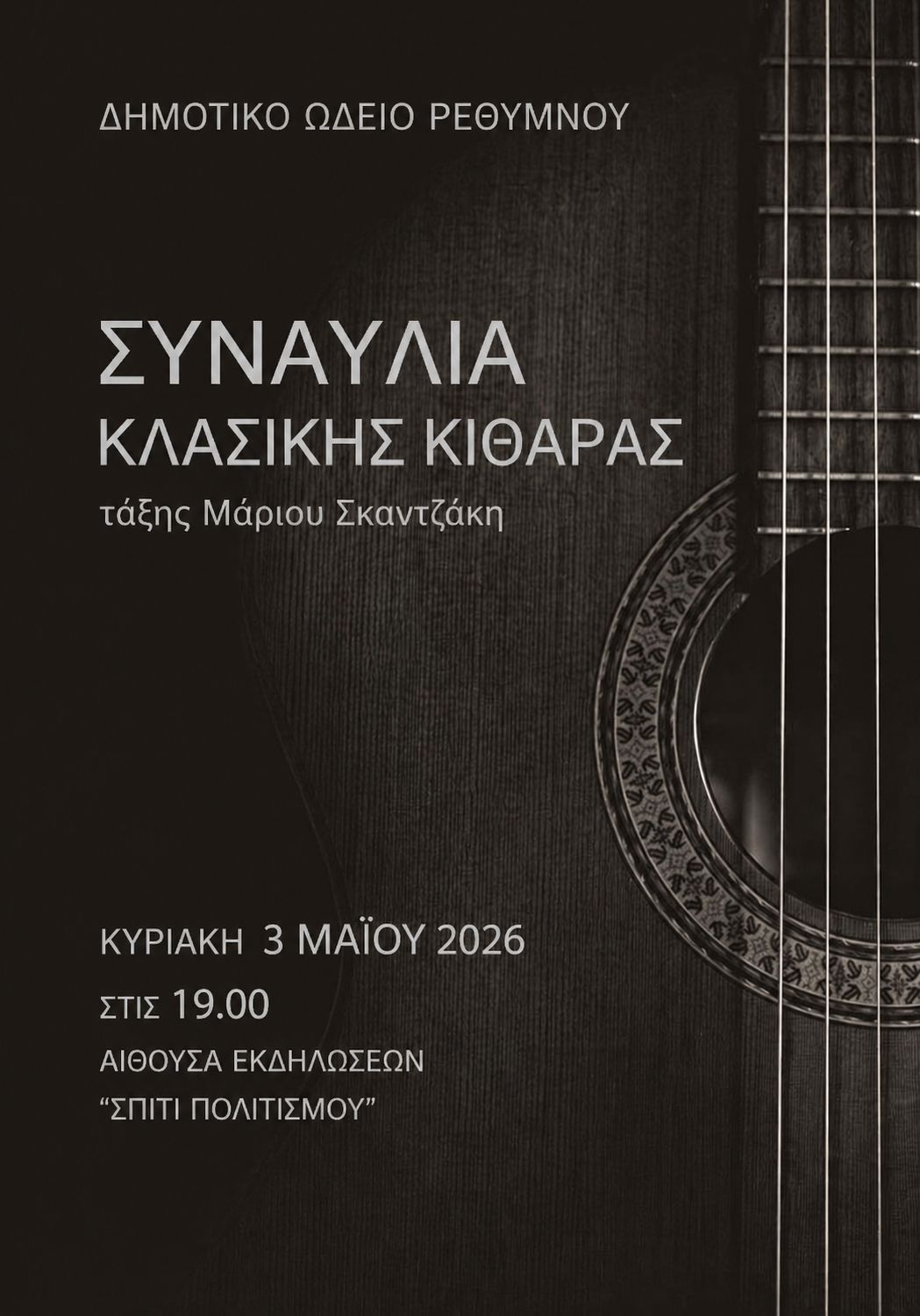 Συναυλία Κλασικής Κιθάρας διοργανώνει το Δημοτικό Ωδείο Ρεθύμνου, την Κυριακή, 03 Μαϊου στις 19:00,στο «Σπίτι του Πολιτισμού».