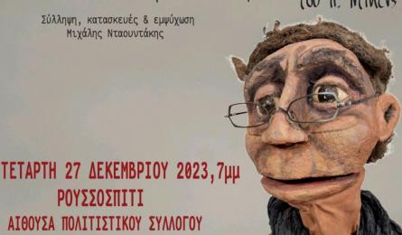 Kουκλοθέατρο στο Ρουσσοσπίτι: «Μια χριστουγεννιάτικη ιστορία» Ο κουκλοπαίχτης Μιχάλης Νταουντάκης παρουσιαζει τη Τετάρτη 27 Δεκεμβρίου στον χώρο του Πολιτιστικού Συλλόγου Ρουσσοσπιτίου στο Ρέθυμνο, την παράσταση... 27.12.2023 09:56