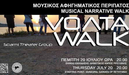 VOΛΤΑ: Μια μουσική αφηγηματική περιπατητική δράση συνεχίζεται και τον Ιούλιο Η μουσική αφηγηματική περιπατητική δράση VOΛΤΑ συνεχίζει το «ταξίδι» της στο Ρέθυμνο με ιδιαίτερη επιτυχία. Μια VOΛΤΑ σε ανεξερεύνητα σημεία της... 17.07.2023 10:25