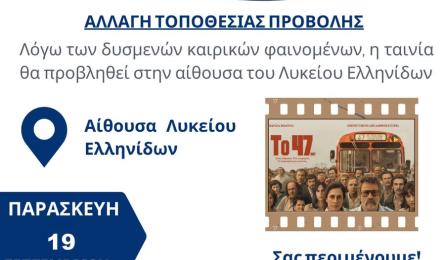 Αλλαγή χώρου για το αφιέρωμα στον Νίκο Βώβο και την προβολή της ταινίας “Το 47” λόγω καιρού Λόγω των αντίξοων καιρικών φαινομένων τροποποιείται το σημερινό πρόγραμμα των εκδηλώσεων του Δήμου Ρεθύμνης στο πλαίσιο της Ευρωπαϊκής... 19.09.2025 11:34