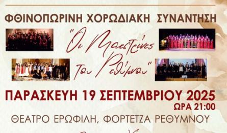 Η Περιφέρεια Κρήτης διοργανώνει την Φθινοπωρινή Χορωδιακή Συνάντηση - "Οι Μαεστρίνες του Ρεθύμνου" 19 Σεπτεμβρίου στη Φορτέτζα Ρεθύμνου στο πλαίσιο του Φεστιβάλ Κρήτης 12.09.2025 16:13