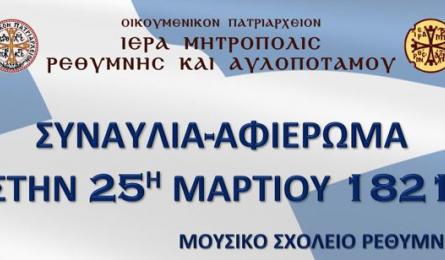 Συναυλία – αφιέρωμα στην 25η Μαρτίου 1821 Η Ιερά Μητρόπολη Ρεθύμνης και Αυλοποτάμου και το Μουσικό Σχολείο Ρεθύμνου διοργανώνουν Συναυλία - Αφιέρωμα στην Εθνική επέτειο της 25ης Μαρτίου 1821,... 10.03.2023 15:33