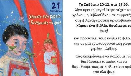 Χάρισε ένα βιβλίο, δυνάμωσε το φως! Το Σάββατο 20 Δεκεμβρίου, στις 19:00, λίγο πριν τη μεγαλύτερη νύχτα του χρόνου, η Βιβλιοθήκη μας συμμετέχει στη φιλαναγνωστική πρωτοβουλία Χάρισε... 16.12.2025 08:57