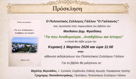 Γάλλου Ρεθύμνης: Παρουσιάζεται το βιβλίου του Ματθαίου Δ. Φραϊδάκη "Τα που αναθυμούμαι...αναθιβάνω και ιστορώ" Το βιβλίο του Ματθαίου Φραϊδάκη "Τα που αναθυμούμαι...αναθιβάνω και ιστορώ" παρουσιάζεται την Κυριακή 1 Μαρτίου σε εκδήλωση που οργανώνει ο... 25.02.2026 21:20
