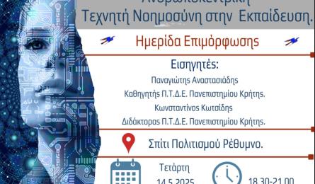 Ρέθυμνο: Επιμορφωτικό πρόγραμμα με θέμα «Ανθρωποκεντρική Τεχνητή Νοημοσύνη στην Εκπαίδευση» Σας ενημερώνουμε ότι οι Διευθύνσεις Α/θμιας και Δ/θμιας Εκπαίδευσης Ρεθύμνου μαζί με τον Σύλλογο Εκπαιδευτικών Πρωτοβάθμιας Εκπαίδευσης Ρεθύμνου... 14.05.2025 01:06