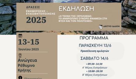 Συνέδριο στα Ανώγεια για την Τέχνη της Ξερολιθιάς και τη Σχέση Φύσης – Πολιτισμού Συνέδριο με θέμα «Η Τέχνη της Ξερολιθιάς: Το ανθρώπινο σύνορο ανάμεσα στη φύση και τον πολιτισμό», θα πραγματοποιηθεί στα Ανώγεια, από τις 13 έως τις... 20.05.2025 11:06