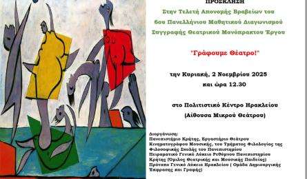 Τελετή Απονομής του 6ου Πανελλήνιου Μαθητικού Διαγωνισμού «Γράφουμε Θέατρο!» — Οι μαθητές ανεβάζουν το δικό τους μικρό θαύμα στη σκηνή Το Πανεπιστήμιο Κρήτης, Εργαστήριο Θεάτρου, Κινηματογράφου και Μουσικής του Τμήματος Φιλολογίας της Φιλοσοφικής Σχολής, Το Πειραματικό Γενικό... 31.10.2025 12:06