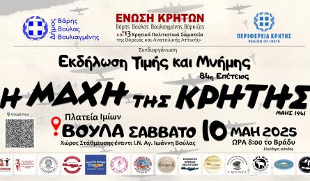 Εκδήλωση Τιμής & Μνήμης - 84η Επέτειος της Μάχης της Κρήτης στην Βούλα Αττικής Με ιδιαίτερη συγκίνηση και περηφάνια, η Κρητών Βάρης, Βούλας, Βουλιαγμένης, Βάρκιζας, σε συνεργασία με 13 ακόμα Κρητικά Πολιτιστικά Σωματεία της... 01.05.2025 23:01