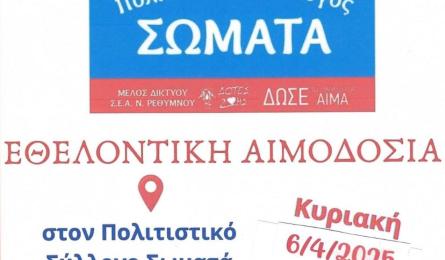 Eθελοντική αιμοδοσία στο Σωματά Ο Πολιτιστικός Σύλλογος Σωματά, περήφανο μέλος του δικτύου του Συλλόγου Εθελοντών Αιμοδοτών Νομού Ρεθύμνου ΔΟΤΕΣ ΖΩΗΣ, σας προσκαλεί σε εθελοντική... 03.04.2025 21:33