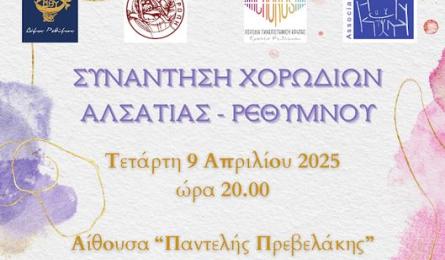 Ρέθυμνο: Μουσική συνάντηση χορωδιών Μουσική συνάντηση χορωδιών θα πραγματοποιηθεί την Τετάρτη 9 Απριλίου 2024 στην πόλη του Ρεθύμνου. Στην αίθουσα «Παντελής Πρεβελάκης» του... 04.04.2025 12:04