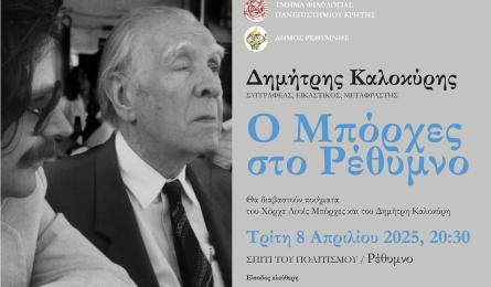 O Mπόρχες στο Ρέθυμνο Το Τμήμα Φιλολογίας του Πανεπιστημίου Κρήτης και ο Δήμος Ρεθύμνης σάς προσκαλούν στην ομιλία του Δημήτρη Καλοκύρη, συγγραφέα, εικαστικού, μεταφραστή,... 03.04.2025 14:01