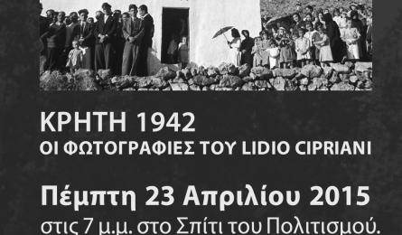 Βιβλιοπαρουσίαση: Κρήτη 1942. Οι φωτογραφίες του Lidio Cipriani Τα Γενικά Αρχεία του Κράτους-Αρχεία Νομού Ρεθύμνης οργανώνουν την παρουσίαση του βιβλίου «Κρήτη 1942. Οι φωτογραφίες του Lidio Cipriani» στο Σπίτι... 17.04.2015 09:10
