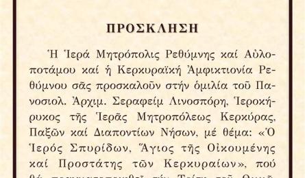 Ομιλία για τον Άγιο Σπυρίδωνα Η Ιερά Μητρόπολις Ρεθύμνης και Αυλοποτάμου και η Κερκυραϊκή Αμφικτιονία Ρεθύμνου σας προσκαλούν στην ομιλία του Πανοσιολ. Αρχιμ. Σεραφείμ Λινοσπόρη,... 16.04.2015 10:08