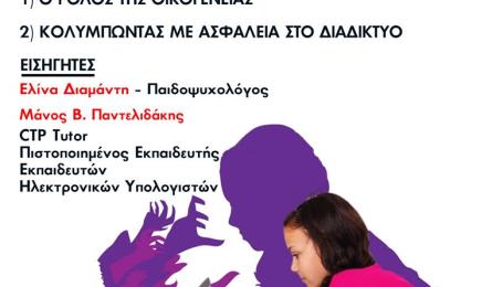 Ομιλία στο δημοτικό σχολείο Σπηλίου στις 1/4 Το Δημοτικό Σχολείο Σπηλίου σας προσκαλεί στην ομιλία – συζήτηση με θέμα «ΠΑΙΔΙ και ΔΙΑΔΙΚΤΥΟ», που διοργανώνει την Τετάρτη 1/4/2015 το απόγευμα... 27.03.2015 12:46