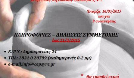 Έναρξη εργαστηριού κεραμικής στο κέντρο ψυχικής υγείας Ρεθύμνου Η δημιουργία των εργαστηριακών δραστηριοτήτων στο Κ.Ψ.Υ έχουν σαν στόχο την βελτίωση, στήριξη ή και διατήρηση του υψηλότερου δυνατού επιπέδου... 03.03.2015 10:40