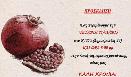 Κέντρο Ψυχικής Υγείας: Εκδήλωση κοπής πρωτοχρονιάτικης πίτας Το Κέντρο Ψυχικής Υγείας προσκαλεί φίλους, εθελοντές και πολίτες του Ρεθύμνου στην εκδήλωση κοπής πρωτοχρονιάτικης πίτας την Τετάρτη 21/01/2015 στις... 15.01.2015 12:40