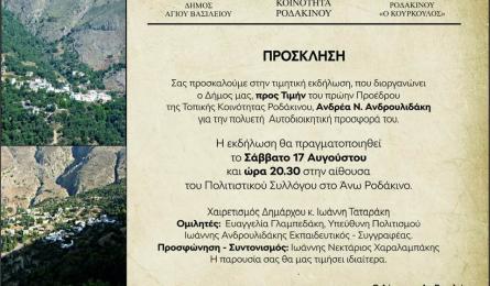 Τιμητική εκδήλωση στον Ανδρέα Ν. Ανδρουλιδάκη στο Ροδάκινο Σας προσκαλούμε στην τιμητική εκδήλωση, που διοργανώνει ο Δήμος μας, προς Τιμήν του πρώην Προέδρου της Τοπικής Κοινότητας Ροδάκινου, Ανδρέα ... 13.08.2024 21:24