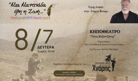 Μια μαντινάδα όλη ζωή! Ο λαογραφικός όμιλος Λάζαρος και Μανόλης Χνάρης, σας προσκαλεί, σε μία εκδήλωση -αφιέρωμα στην Κρητική μαντινάδα ! Με τιμητική αναφορά στο έργο... 03.07.2024 13:03