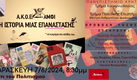 Προβολή ντοκιμαντερ ΑΚΟΕ/ΑΜΦΙ: Η ιστορία μιας Επανάστασης (*Να κοιμάμαι στο στήθος του) Την Παρασκευή 7 Ιουνίου, ώρα 20:30, στο Σπίτι του Πολιτισμού (Εμμ. Βερνάρδου 12), Το Τμήμα Κοινωνιολογίας και το Κέντρο Ανθρωπίνων Δικαιωμάτων του... 03.06.2024 15:28