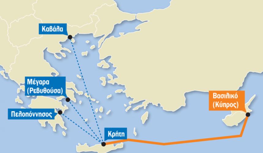 Η διαδρομή που κατέθεσε η ελληνική πλευρά για τον αγωγό East Med, που εντάχθηκε στη λίστα των έργων PCI, ξεκινά από τον σταθμό του Βασιλικού στην Κύπρο και καταλήγει αρχικά στην Κρήτη. Από εκεί υπάρχουν τρεις εναλλακτικές διαδρομές, η πρώτη προς την Πελοπόννησο, ώστε στη συνέχεια να διασυνδεθεί με τον αγωγό TAP, η δεύτερη προς τη Βόρεια Ελλάδα και από εκεί προς τη Βουλγαρία, μέσω του ελληνοβουλγαρικού αγωγού IGB, και η τρίτη προς τον τερματικό σταθμό αεριοποίησης της Ρεβυθούσας.
