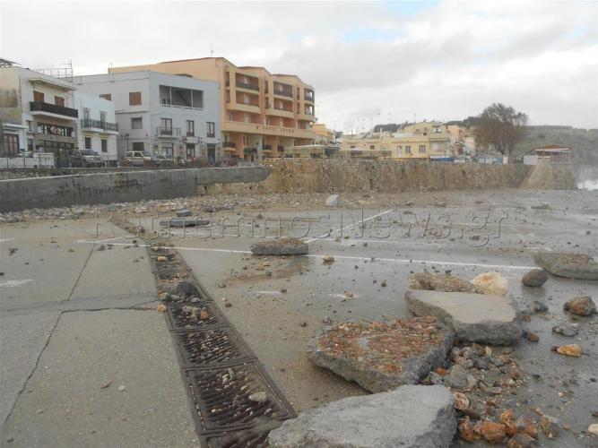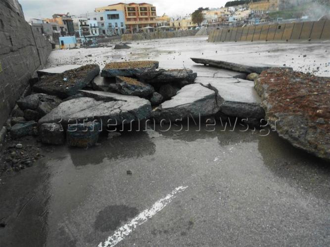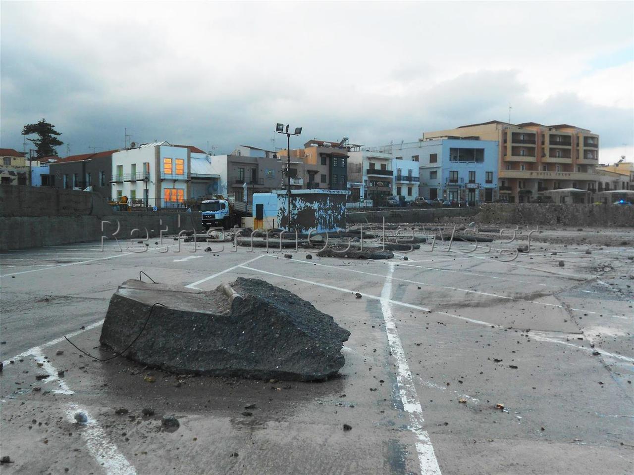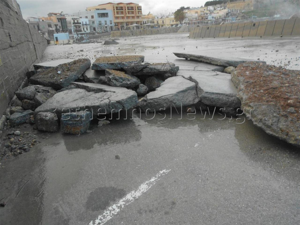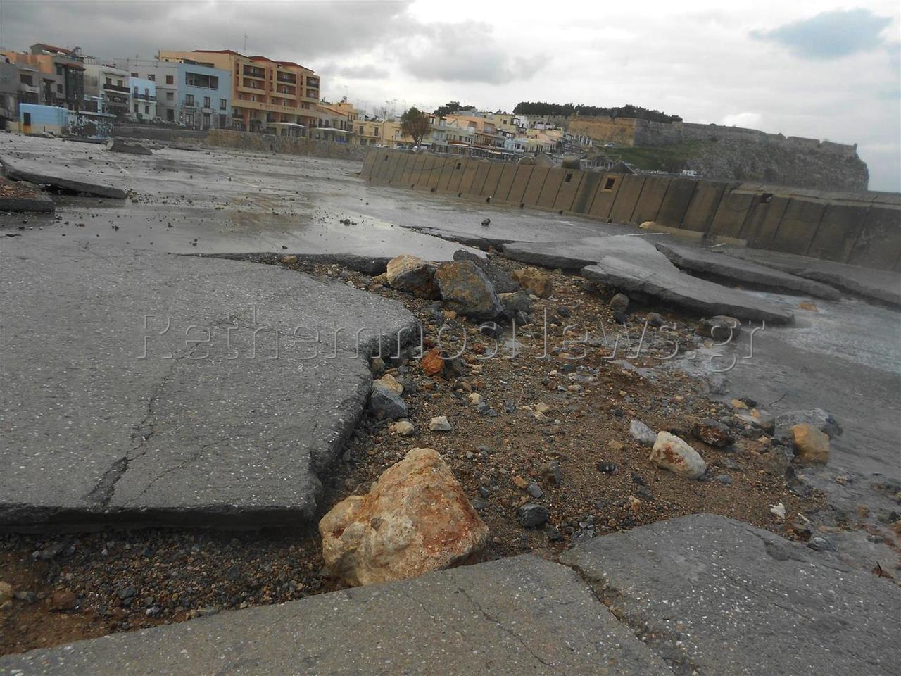 Πιο συγκεκριμένα, η κακοκαιρία στην αρχή της εβδομάδας με τους ανέμους που έφτασαν έως και τα 10 Μποφώρ όχι μόνο πλημμύρισε για μια ακόμα φορά το λιμάνι του Ρεθύμνου και το παρακείμενο παρκινγκ, με τα νερά να φτάνουν και μέχρι την παλιά πόλη, αλλά κυριολεκτικά γκρέμισε προστατευτικό τοιχίο μεταφέροντας τόνους ογκόλιθων δεκάδες μέτρα μακριά και ξήλωσε μεγάλο μέρος από το μπετόν στο παρκινγκ δημιουργώντας τεράστιες τρύπες.