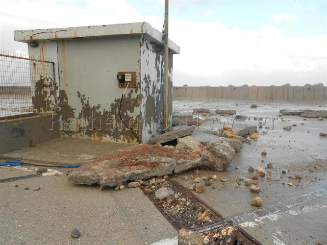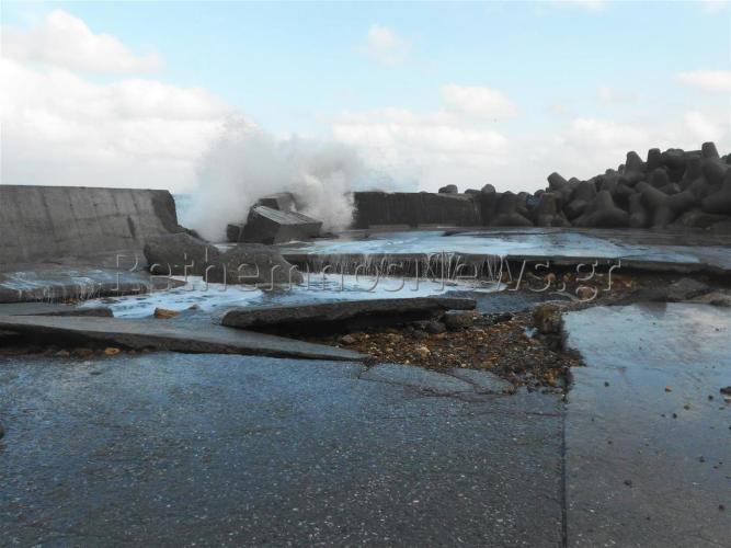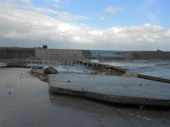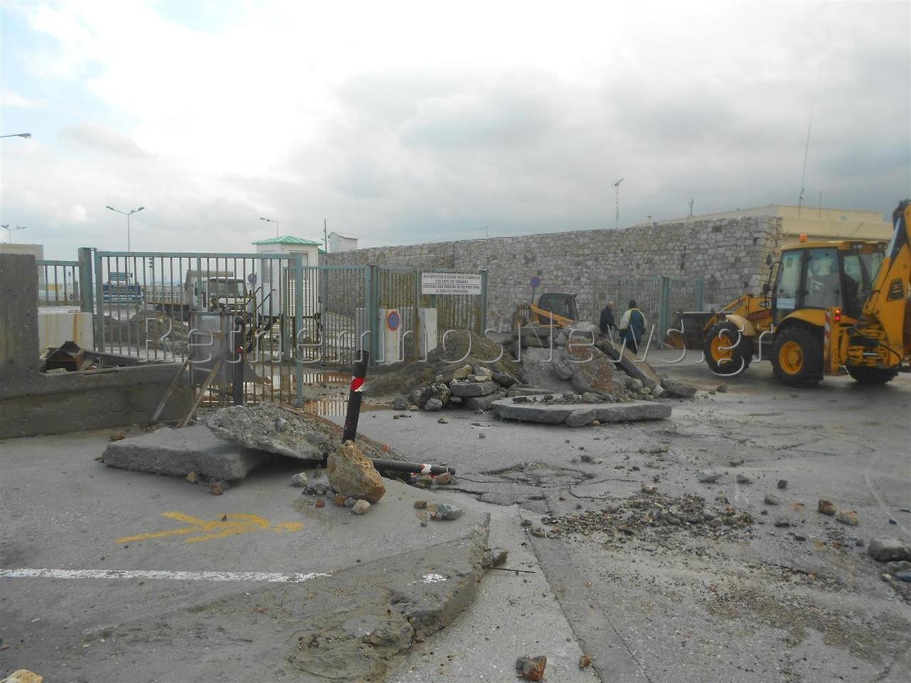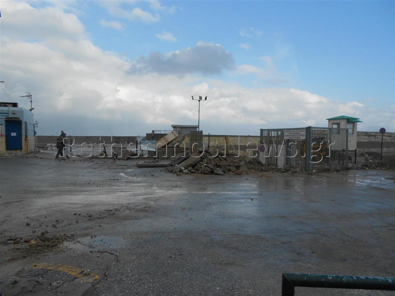 Οι πρωτοφανείς και ακραίες καιρικές συνθήκες, άφησαν πίσω τους μεγάλες καταστροφές στο χώρο του λιμανιού όπου κυριολεκτικά βούλιαξε όταν το δυνατό κύμα έσπασε προστατευτικό τοιχίο στο χώρο που πάρκινγκ, με αποτέλεσμα τεράστιες ποσότητες νερού να κατακλύσουν την περιοχή. Η δύναμη του νερού ήταν τέτοια που κυριολεκτικά γκρέμισε το τοιχίο και ξήλωσε τεράστια κομμάτια μπετόν που αποτελούσαν το δάπεδο του παρκινγκ, μεταφέροντας τα, ακόμη και μέχρι το δρόμο.