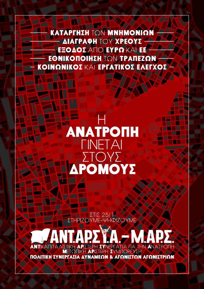 -  Να ενισχυθεί  η ΑΝΤΑΡΣΥΑ - Μετωπική Αριστερή Συμπόρευση. Η ασυμβίβαστη, ανυποχώρητη και μαχόμενη Αριστερά της Αντίστασης και της Ανατροπής, η Αριστερά της ελπίδας.