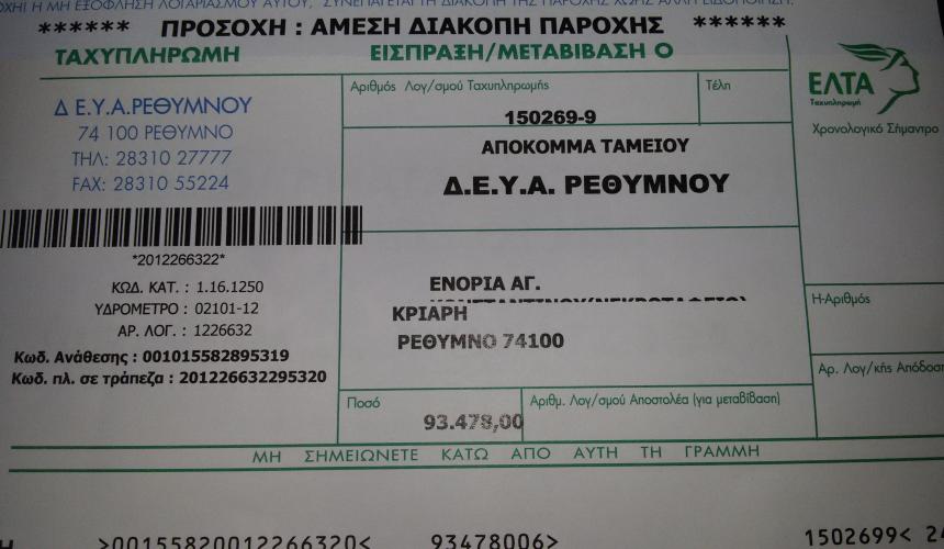 Από τα σύννεφα έπεσε το Εκκλησιαστικό Συμβούλιο της Ενορίας του Αγίου Κωνσταντίνου στο Ρέθυμνο, όταν έλαβε λογαριασμό νερού με πληρωτέο ποσό 93.478 ευρώ! Ο παραφουσκωμένος λογαριασμός αφορά στο ενοριακό νεκροταφείο του Αγ. Κωνσταντίνου στο Ρέθυμνο, το οποίο σύμφωνα με τον εφημέριο του ναού, πατέρα Δημοσθένη πρώτη φορά στα χρόνια λειτουργίας του, κλήθηκε να πληρώσει λογαριασμό νερού.