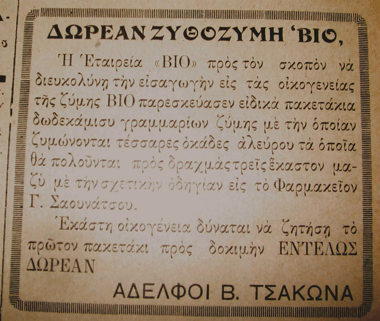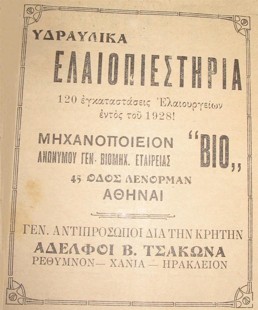 Την εποχή εκείνη τα ελαιοπιεστήρια και γενικότερα οι μηχανές επεξεργασίας της ελιάς με την επωνυμία «ΒΙΟ» ήταν ο πιο προβεβλημένος μηχανολογικός εξοπλισμός της εποχής. Αντιπρόσωποι της εταιρείας στην Κρήτη ήταν οι Αφοί Τσάκωνα, οι οποίοι και προμήθευσαν το σχετικό μηχανολογικό εξοπλισμό στο εργοστάσιο Σαπωνοποιίας – Ραφιναρίας της Ανωνύμου Εταιρείας «Ελαιουργεία Της Ελλάδος», η οποία έμεινε στην ιστορία ως «Ε.Τ.Ε.Λ. Α.Ε.».