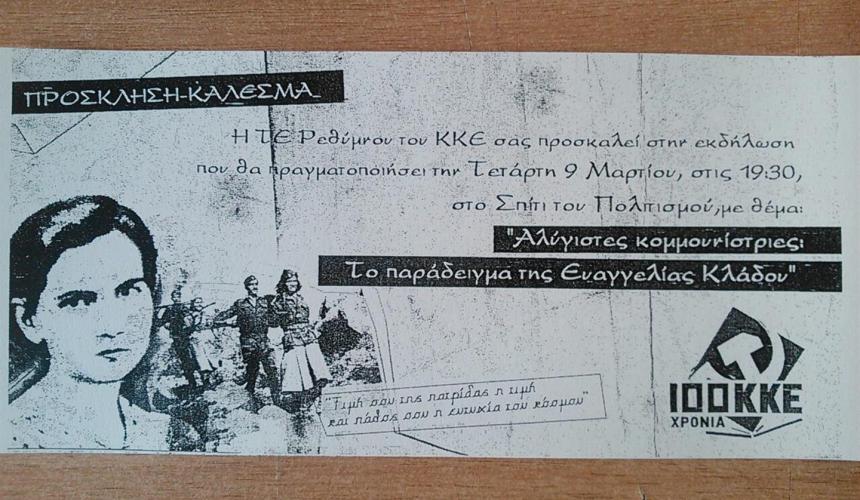 Εκδήλωση θα πραγματοποιηθεί την Τετάρτη 9/3 από την Τομεακή Οργάνωση Ρεθύμνου του ΚΚΕ, στις 19:30 στο Σπίτι του Πολιτισμού. Θέμα της εκδήλωσης θα είναι «Αλύγιστες κομμουνίστριες: Το παράδειγμα της Ευαγγελίας Κλάδου». Μπροστά στη συμπλήρωση των 100 χρόνων του Κόμματος το 2018, με απόφαση της Κ.Ε πραγματοποιούνται εκδηλώσεις πανελλαδικά οι οποίες αναδεικνύουν την τοπική ιστορία δράσης του Κόμματος, αλλά και έχουν σκοπό να αναδείξουν αλύγιστους κομμουνιστές, που σφράγισαν με την δράση τους την ηρωική πορεία του Κόμματος.