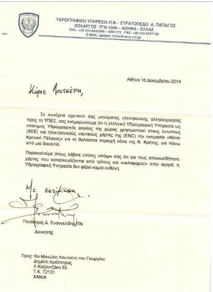 Σας διαβιβάζω και το έγγραφο και το χάρτη της Υδρογραφικής μας Υπηρεσίας, όπου φαίνονται όλα τα παραπάνω.