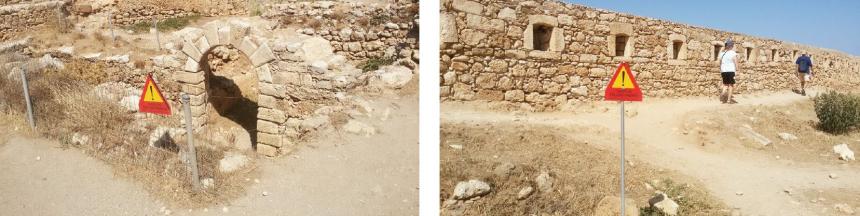 Μικρά τριγωνικά σήματα που δηλώνουν τον κίνδυνο ατυχήματος, έχουν τοποθετηθεί σε διάφορα σημεία της Φορτέτζας, με έμφαση στη δυτική πλευρά, όπου υπάρχουν επικίνδυνα σημεία για πιθανή πτώση επισκεπτών. Πάντως, εκτός από τη σήμανση, το προστατευτικό σύρμα που έχει τοποθετηθεί, πέρα από αντιαισθητικό είναι και ελλιπές.