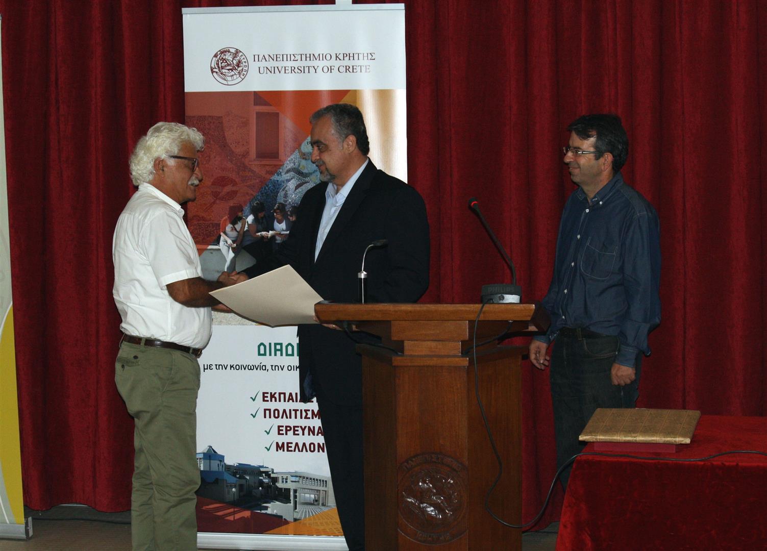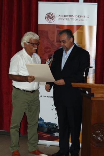 H απονοµή πραγµατοποιήθηκε από τον Κοσµήτορα της Σχολής Κοινωνικών, Οικονοµικών και Πολιτικών Επιστηµών, Καθηγητή ∆ηµήτριο Μυλωνάκη. Ο Αναπληρωτής Πρύτανης του Πανεπιστηµίου Κρήτης κ. Κωνσταντίνος Σπανουδάκης πρόσφερε αναµνηστικό δώρο (βιβλίο) στον τιµώµενο και ο Πρόεδρος του Τµήµατος Κοινωνιολογίας κ. Ζαϊµάκης του πρόφερε µια γκραβούρα. Ο Καθηγητής κ. Σκεύος Παπαϊωάννου µίλησε στο κοινό και ανέλυσε το θέµα: «Κοινωνιολογία και Κρίση» .