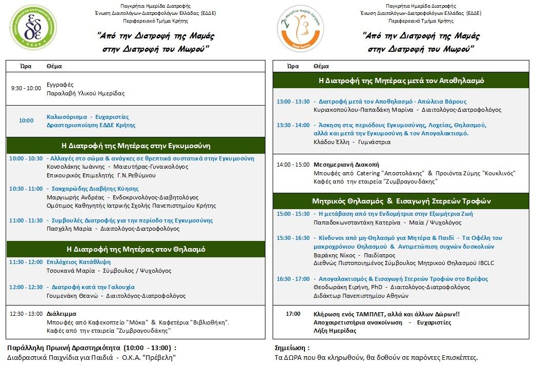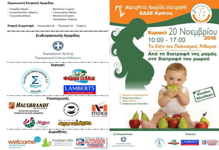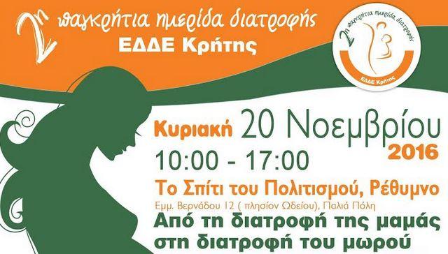 Στα πλαίσια της κοινωνικής ευαισθησίας της Ένωσης Διαιτολόγων-Διατροφολόγων Ελλάδας (ΕΔΔΕ) και με στόχο την σωστή ενημέρωση του κοινού σε θέματα Διατροφής, το Περιφερειακό Τμήμα Κρήτης της ΕΔΔΕ, ως επίσημος φορέας εκπροσώπησης των επαγγελματιών Διαιτολόγων-Διατροφολόγων, διοργανώνει την 2η Παγκρήτια Ημερίδα Διατροφής, με τίτλο: “Από τη Διατροφή της Μαμάς, στη Διατροφή του Μωρού”, την Κυριακή 20 Νοεμβρίου 2016. Η εκδήλωση θα διεξαχθεί στο “Σπίτι του Πολιτισμού”, στο Ρέθυμνο (παλιά πόλη), με την συνδιοργάνωση της Περιφερειακής Ενότητας Ρεθύμνου.