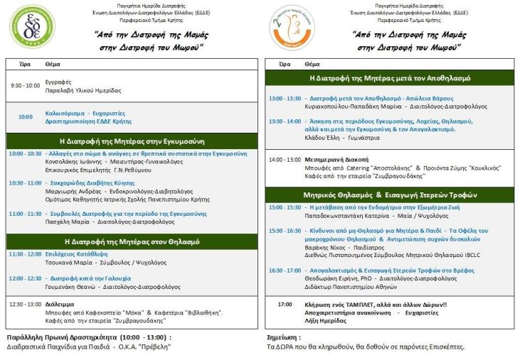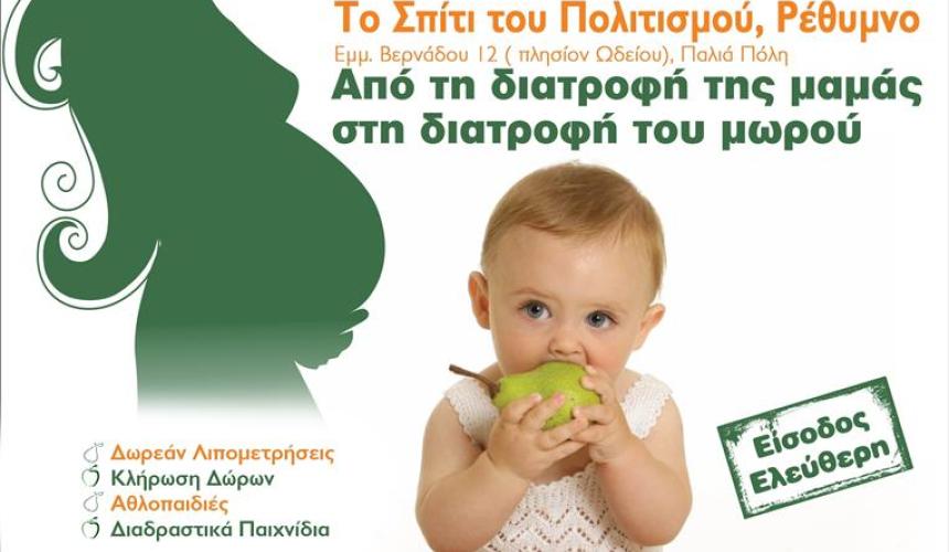 Η διεξαγωγή της συγκεκριμένης Ημερίδας στο Ρέθυμνο, έρχεται σε συνέχεια των 2 αντίστοιχων Ημερίδων που διεξήχθησαν σε Ηράκλειο (16/10) και Άγιο Νικόλαο (23/10). Η θεματολογία των ομιλιών θα ποικίλει (Διατροφή, Υγεία, Ψυχολογία, Άσκηση) και θα πλαισιώνει τις περιόδους της εγκυμοσύνης, του θηλασμού, του αποθηλασμού, αλλά και τα πρώτα στάδια της βρεφικής Διατροφής, με άρτια καταρτισμένους επιστήμονες για το κάθε θέμα που θα αναπτυχθεί (Διαιτολόγοι, Γυναικολόγος, Ενδοκρινολόγος, Ψυχολόγος, Γυμναστής, Παιδίατρος, Σύμβουλος Θηλασμού, Μαία).