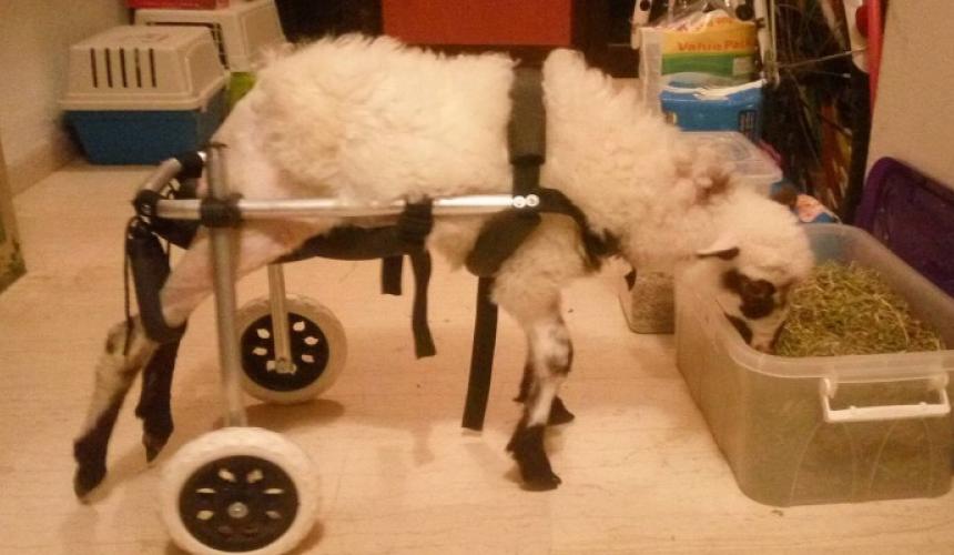 Χάρη στις ρόδες του αναπηρικού αμαξίδιου της η Γιαννούλα το θηλυκό αρνάκι που βρέθηκε παράλυτο και εγκαταλελειμμένο στον Ψηλορείτη της Κρήτης μπορεί πια όχι απλά να κινείται αλλά να τρέχει.