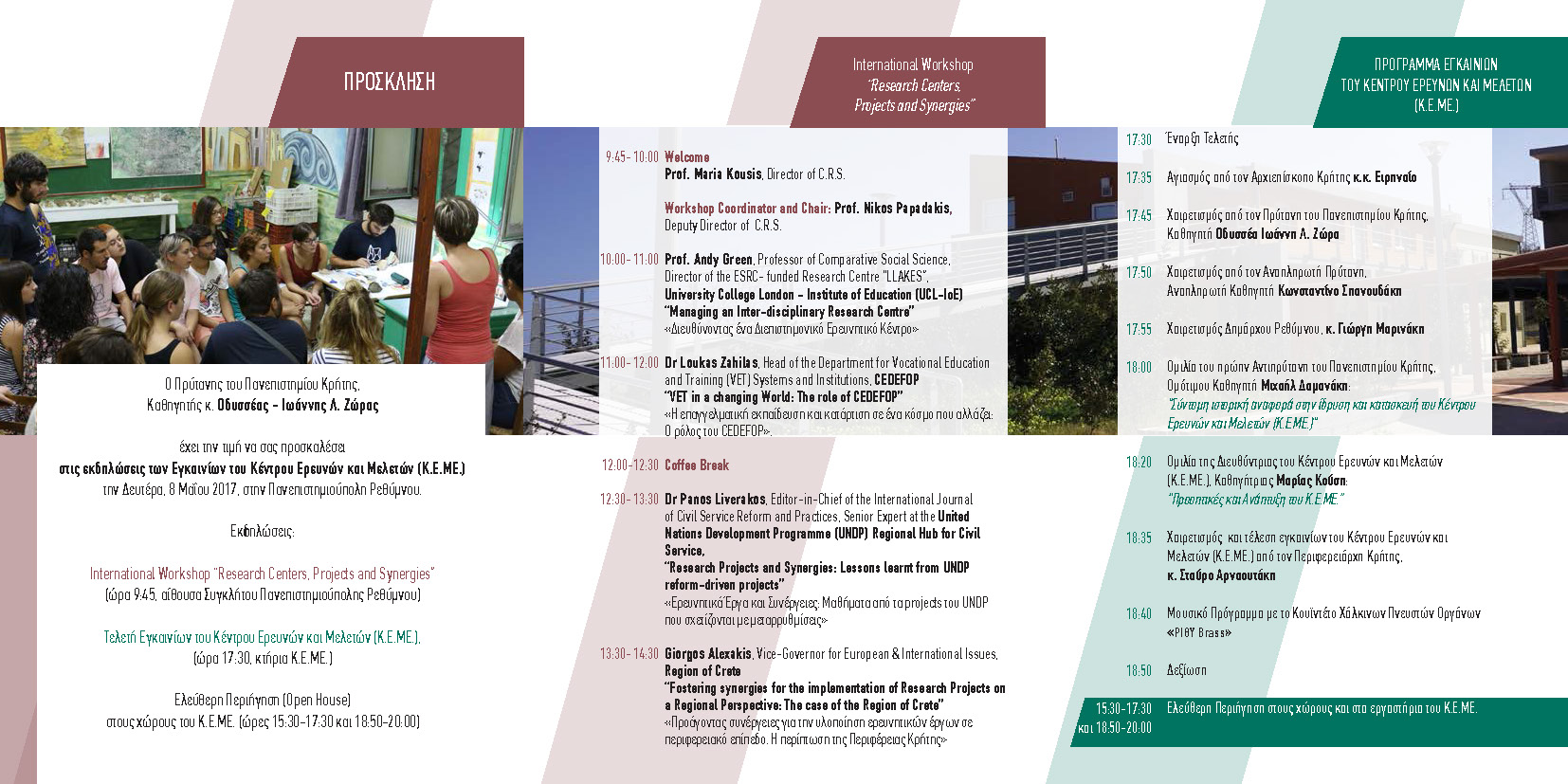 Στις εκδηλώσεις των εγκαινίων θα συμμετάσχουν με ομιλίες διακεκριμένοι επιστήμονες από την Ελλάδα και το εξωτερικό και συγκεκριμένα ο Καθηγητής Andy Green, Διευθυντής του ESRC- funded Research Centre “LLAKES” του University College London και μέλος της Βρετανικής Ακαδημίας Κοινωνικών Επιστημών, ο Δρ Λουκάς Ζαχείλας, Head of the VET Department του CEDEFOP (Ευρωπαϊκού Κέντρου για την Ανάπτυξη της Επαγγελματικής Κατάρτισης), ο Δρ Πάνος Λιβεράκος, Senior Expert στο Regional Hub for Civil Service του UNDP (Προγράμματος των Ηνωμένων Εθνών για την Ανάπτυξη), ο Ομότιμος Καθηγητής Μιχάλης Δαμανάκης, πρ. Αντιπρύτανης του Πανεπιστημίου Κρήτης, όπως και ο Αντιπεριφερειάρχης Ευρωπαϊκών και Διεθνών Θεμάτων, κος Γιώργος Αλεξάκης.