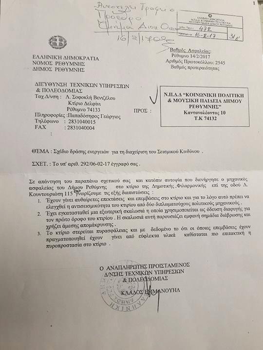 «Μετά την αυτοψία που διενήργησε ο μηχανικός ασφαλείας του Δήμιου Ρεθύμνης στο κτίριο της Δημοτικής «Φιλαρμονικής επί της οδού Λ. Κουντουριώτη 115 σας γνωρίζουμε τις εξής διαπιστώσεις :