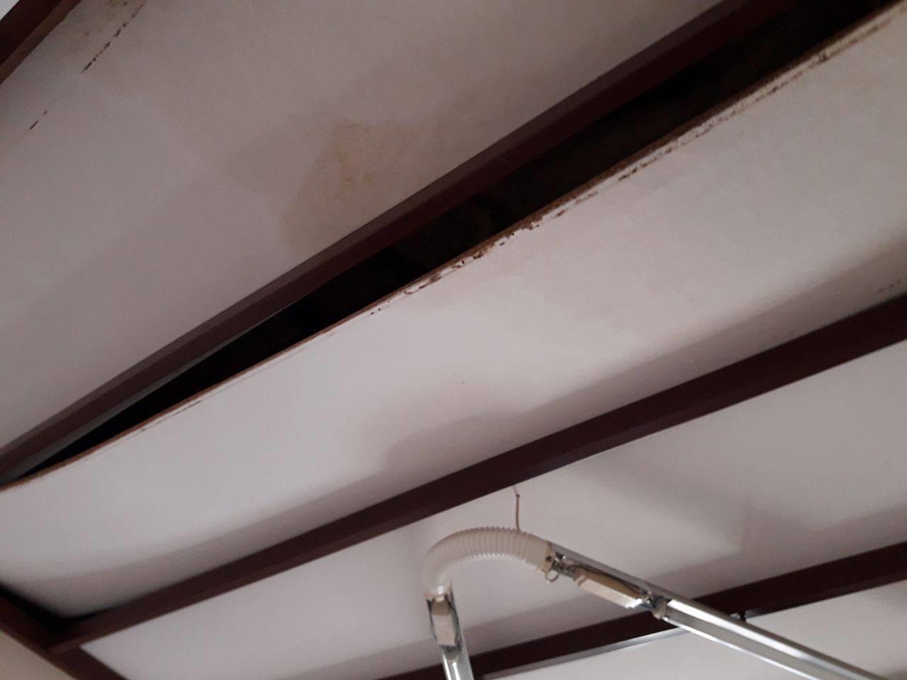 Πάνω ψευδοροφές που κρέμονται και κάτω φθορές και κακοτεχνίες στο πάτωμα. Παντού έχουν χρησιμοποιηθεί εύφλεκτα υλικά, χωρίς το κτήριο να διαθέτει πυρασφάλεια.