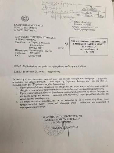 Τις καταγγελίες των γονέων που μιλούσαν για παντελή παραμέληση του κτηρίου, έρχεται να επιβεβαιώσει με έγγραφο της η Διεύθυνση Τεχνικών Υπηρεσιών και Πολεοδομίας του Δήμου Ρεθύμνης που συντάχθηκε μετά την αυτοψία που διενήργησε ο μηχανικός ασφαλείας του δήμου.