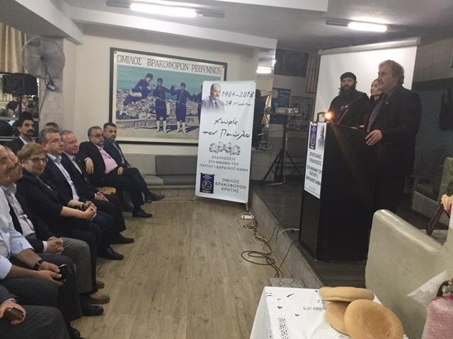 Τους παριστάμενους καλωσόρισε ο Πρόεδρος του Ομίλου Βρακοφόρων Στέλιος Κιαγιαδάκης, ο οποίος αναφέρθηκε στην επιτυχημένη εκδήλωση, θεσμό του Ομίλου, επισημαίνοντας το χρέος απόδοσης τιμής και αναγνώρισης, όπως είπε, στην προσφορά του Παύλου Βαρδινογιάννη στους πολίτες του Ρεθύμνου, στα προβλήματα, στις χαρές και στις λύπες τους αλλά και στην προώθηση του κοινού καλού εντός κι εκτός Κρήτης.