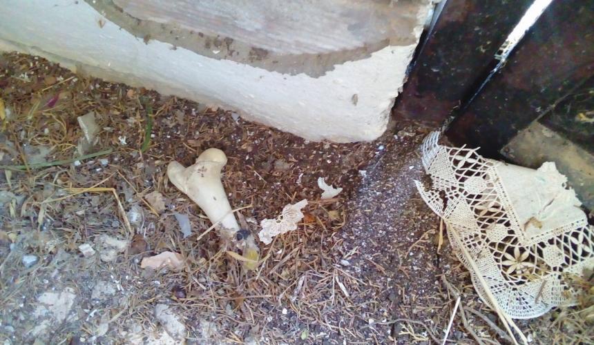 Το χειρότερο όλων είναι η εγκατάλειψη που παρουσιάζει μέσα το Οστεοφυλάκιο: κατεστραμμένα ράφια, σπασμένα και αναποδογυρισμένα κασελάκια με τα οστά των νεκρών να μισοκρέμονται, σπασμένες οστεοθήκες, κόκαλα εκτεθειμένα και σκορπισμένα στο πάτωμα μισοφαγωμένα από τα σκυλιά. Στις φωτογραφίες που επισυνάπτω μπορείτε να δείτε την απαράδεκτη κατάσταση που επικρατεί: κρανία και οστά από άκρα, πόδια και, μάλλον, χέρια νεκρών, τμήματα της σπονδυλικής τους στήλης στο πάτωμα δίπλα σε περιττώματα ποντικών και άλλες ακαθαρσίες, εμφανώς μισοφαγωμένα από ζώα.