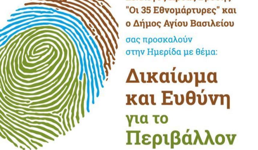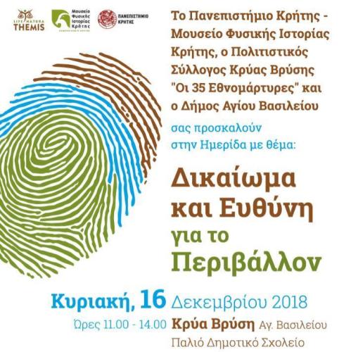 Στο πλαίσιο αυτό, η εκστρατεία ενημέρωσης του κοινού με τίτλο «Δικαίωμα και Ευθύνη για το Περιβάλλον», συνεχίζεται με τη διοργάνωση της 2ης ημερίδας του έργου την Κυριακή 16 Δεκεμβρίου 2018 στις 11.00-14.00 στην Κρύα Βρύση Δήμου Αγίου Βασιλείου σε συνεργασία με τον Πολιτιστικό Σύλλογο Κρύας Βρύσης «Οι 35 Εθνομάρτυρες» και την υποστήριξη του Δήμου Αγίου Βασιλείου. Η ημερίδα θα πραγματοποιηθεί στο Παλαιό Δημοτικό Σχολείο της Κρύας Βρύσης.
