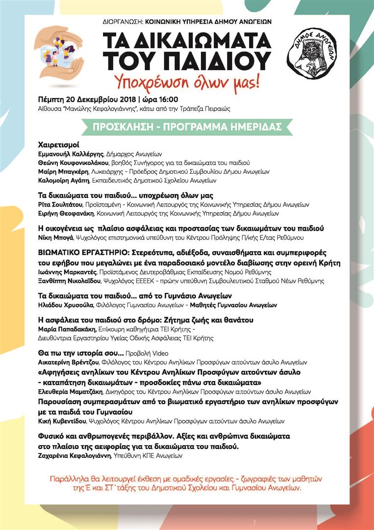 Στα πλαίσια εορτασμού της Παγκόσμιας Ημέρας για τα Δικαιώματα του Παιδιού- 20 Νοεμβρίου- η Κοινωνική Υπηρεσία του Δήμου Ανωγείων έχει ξεκινήσει από τις 15 Νοεμβρίου και συνεχίζει μια σειρά δράσεων ευαισθητοποίησης της τοπικής κοινωνίας πάνω στο συγκεκριμένο θέμα.