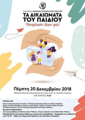 Το επιστέγασμα όλων των δράσεων για την προαγωγή και προάσπιση των δικαιωμάτων των παιδιών είναι η υλοποίηση της ημερίδας με θέμα «Τα δικαιώματα του παιδιού.. υποχρέωση όλων μας». που θα πραγματοποιηθεί την Πέμπτη 20 Νοεμβρίου και ώρα 4μ.μ