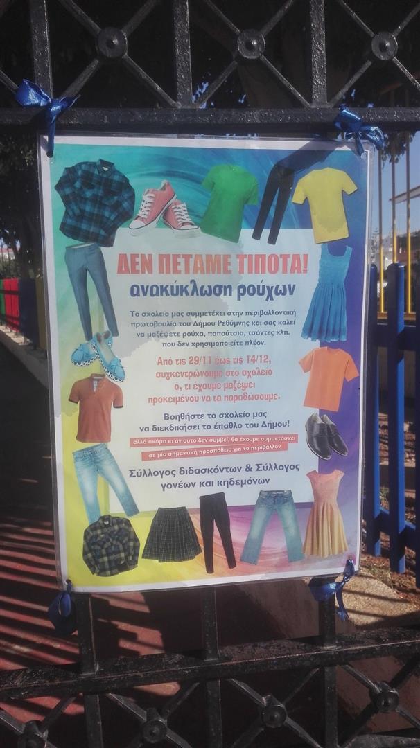 Με αυτή την ενημέρωση προς τους Διευθυντές των Σχολείων και τους εκπροσώπους Συλλόγων Γονέων από τα Δημοτικά Σχολεία που συμμετείχαν στην καμπάνια, ο Διευθύνων Σύμβουλος της εταιρείας RECYCOM κ. Βαγγέλης Αράπης, συνεχάρη τις σχολικές κοινότητες που ανταποκρίθηκαν στην εκστρατεία καθώς και το Δήμο Ρεθύμνης αφού είναι ο πρώτος Δήμος στη χώρα που ανέλαβε αυτή την πρωτοβουλία και την υποστήριξε, αποτελώντας παράδειγμα και για άλλους Δήμους που υιοθέτησαν ανάλογη δράση, η οποία τώρα είναι σε εξέλιξη. Ο Αντιδήμαρχος Καθαριότητας κ. Στέλιος Σαμψών και Πρ/νη Δνχης Καθαριότητας, Περιβάλλοντος και Πρασίνου κα Νικολέτα Γκολφινοπούλου καλωσόρισαν τους διακριθέντες και αφού τους κατέθεσαν τα συγχαρητήρια τους και τις ευχαριστίες του Δήμου για την ανταπόκρισή τους στην περιβαλλοντική αυτή δράση απένειμαν τις τιμητικές διακρίσεις και τα χρηματικά έπαθλα (τα οποία διέθεσε η RECYCOM) στους Δ/ντες και εκπροσώπους Συλλόγων Γονέων των Σχολείων, τα οποία αξιολογήθηκαν με βάση το βάρος των ρούχων που κατάφεραν να συγκεντρώσουν κι έχουν ως εξής (αναφέρονται κατά φθίνουσα σειρά):